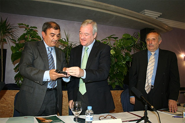En el transcurso del acto el jefe del Ejecutivo regional recibió, de manos del presidente de la Unión de Cooperativas de Murcia de la Región de Murcia y de UCOERM, Juan Antonio Pedreño, la insignia de Oro de esta institución por su apoyo a la misma.