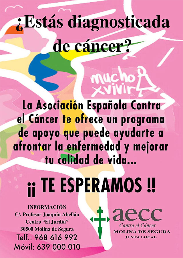 La Junta Local de la Asociación Española Contra el Cáncer (A.E.C.C.) en Molina de Segura ha puesto en marcha el programa Mucho por Vivir, de apoyo a mujeres diagnosticas de cáncer, cuya primera actividad tendrá lugar el miércoles 18 de junio, a las 18.00 horas, en los locales de la sede de la Junta Local, en el Centro El Jardín (en Calle Profesor Joaquín Abellán, nº 8).