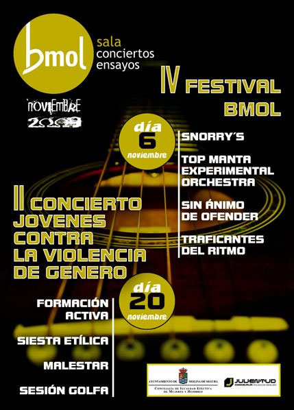 La Concejalía de Juventud, en colaboración con los grupos que hacen uso de los locales de ensayo de la Sala BMOL, organiza por cuarto año consecutivo un concierto para mostrar la labor creativa de estas formaciones musicales. El IV Festival BMOL tendrá lugar el viernes 6 de noviembre, con la participación de los siguientes grupos: SNORRY´S, TOP MANTA EXPERIMENTAL ORCHESTRA, SIN ÁNIMO DE OFENDER y TRAFICANTES DEL RITMO.