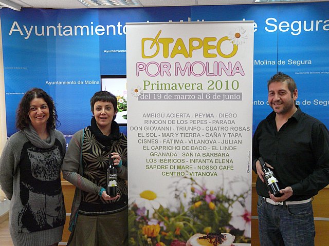 La Campaña De Tapeo por Molina, denominada Primavera 2010, promovida por la Concejalía de Comercio, Artesanía y Turismo del Ayuntamiento de Molina de Segura, tendrá lugar del 19 de marzo al 6 de junio, con el objetivo de fomentar la gastronomía del municipio y acercar la oferta existente a residentes y visitantes. La iniciativa ha sido presentada en rueda de prensa hoy miércoles 17 de marzo, por la Concejala de Comercio, Artesanía y Turismo, Sonia Carrillo Mármol, y dos de los restauradores participantes, Resurrección García Moreno, de Restaurante Julián, y José Antonio Delgado Valero, del Bar Restaurante Centro, que han aprovechado la ocasión para realizar también la presentación de la recientemente constituida Asociación Gastronómica Cultural de Molina de Segura, en calidad de Presidenta y Tesorero de la misma, respectivamente.