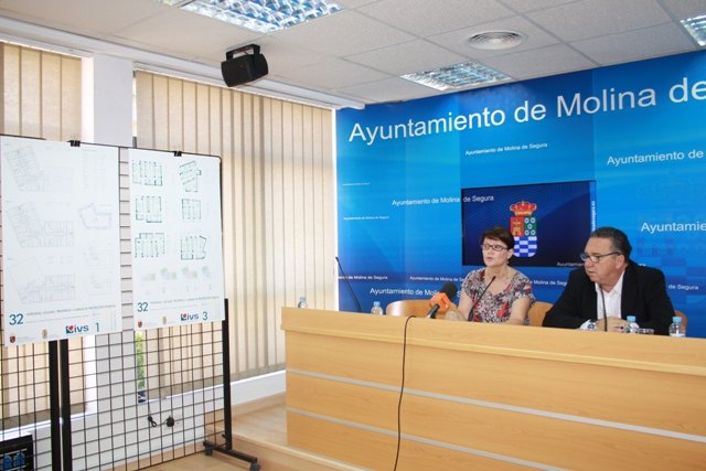La directora gerente del Instituto de Vivienda y Suelo de la Región (IVS), Juana Castaño, acompañada del alcalde de Molina de Segura, Eduardo Contreras, presentó hoy el proyecto para la construcción de 32 nuevas viviendas protegidas, en régimen de venta, que el Ejecutivo autonómico adjudicará mediante sorteo público ante notario el próximo 30 de septiembre.