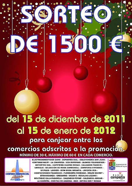 -          Sorteo de 1.500 euros. Los comercios adheridos a esta campaña, en total 31, entregarán un ticket por compra a los clientes, para poder participar en este sorteo, que se realizará el 16 de enero en directo en Radio Compañía. El premio de 1.500 euros será repartido en un talonario con vales de 30, 40, 50 y 60 euros, que el cliente afortunado deberá gastar uno en cada comercio adherido a la promoción.