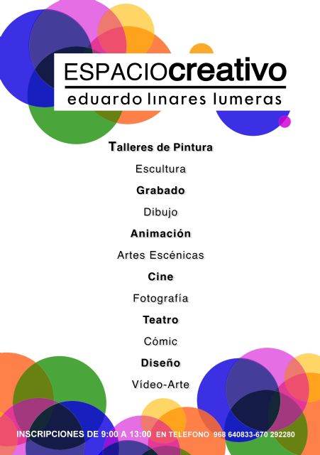 Espacio Creativo Eduardo Linares Lumeras está abierto a los alumnos del centro y al resto de ciudadanos con 17 o más años de edad. El horario de inscripción es de 09.00 a 13.00 horas, en el propio instituto o a través de los números de teléfono 968 64 08 33 y 670 29 22 80. Todos los talleres se desarrollarán en el centro en horario de tarde.