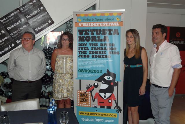 El B SIDE Festival de Molina de Segura se celebra el sábado 8 de septiembre, en el Campo Municipal de Fútbol Sánchez Cánovas de Molina de Segura. Contará con la actuación de Vetusta Morla, Dry The River, Fuel Fandango, The Zombie Kids y Jero Romero. La apertura de puertas tendrá lugar a las 20.00 horas y el precio de las entradas es de 20 euros anticipada, y 25 euros en taquilla. La octava edición del festival ha sido presentada en rueda de prensa hoy jueves 5 de julio, en el Restaurante La Marimorena de Molina de Segura, por el Alcalde de Molina de Segura, Eduardo Contreras Linares, la Concejala de Cultura y Festejos, Mariola Martínez Robles, la Concejala de Nuevas Tecnologías, Victoria Gómez Alcázar, y el Director del festival, Carlos Hernández Ruiz.