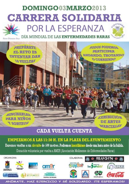 Las concejalías de Sanidad y Deportes del Ayuntamiento de Molina de Segura y la Asociación Molinense de Enfermedades Raras (AMER), en colaboración con el Hospital de Molina, y los centros de salud Profesor Antonio García y Profesor Jesús Marín, han organizado la Carrera Solidaria por la Esperanza a favor de AMER, que tendrá lugar el domingo 3 de marzo, a las 11.30 horas, en Plaza del Ayuntamiento.