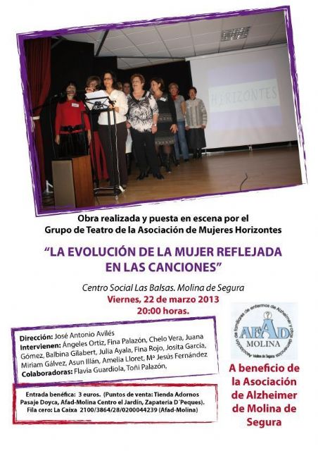 La obra de teatro La evolución de la mujer reflejada en las canciones será representada por el grupo de teatro de la asociación de mujeres Horizontes el viernes 22 de marzo, a las 20.00 horas, en el salón de actos del Centro Las Balsas (en Calle Cartagena, junto a Plaza de los Grifos). La recaudación obtenida irá a beneficio de la Asociación de Familiares de Enfermos de Alzheimer u otras Demencias de Molina de Segura (AFAD Molina).