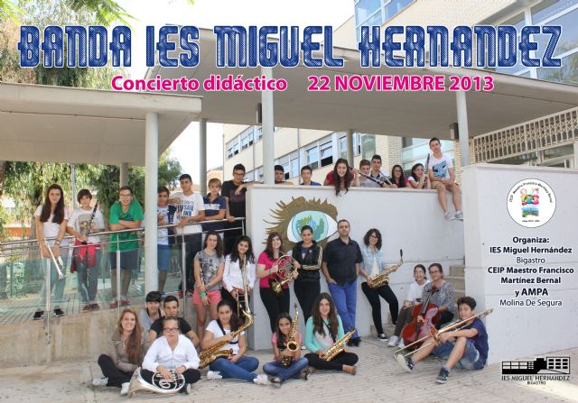 La Banda del I.E.S. Miguel Hernández de Bigastro (Alicante) ofrecerá un concierto didáctico con motivo de la celebración de la festividad de Santa Cecilia, patrona de la música, el viernes 22 de noviembre, en el C.E.I.P. Maestro Francisco Martínez Bernal (en Calle José Antonio Vidal Serrano, n° 80, de Molina de Segura). Esta actividad está preparada por toda la comunidad escolar de los dos centros y sufragada por la AMPA del colegio molinense.