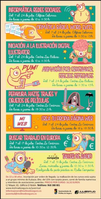 La Concejalía de Juventud del Ayuntamiento de Molina de Segura ha organizado un total de ocho cursos, que se desarrollarán durante el mes de julio de de 2014, dirigidos los jóvenes de la localidad, de 13 a 30 años de edad. El plazo de inscripción comienza el martes 10 de junio, en la Concejalía de Juventud, en Edificio El Retén, 1° planta (número de teléfono: 968 388 801).