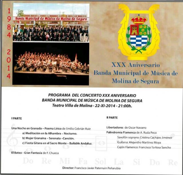 El CONCIERTO DEL XXX ANIVERSARIO DE LA BANDA MUNICIPAL DE MÚSICA DE MOLINA DE SEGURA se celebra el sábado 22 de noviembre, a las 21.00 horas, en el Teatro Villa de Molina (en Avenida del Chorrico, n° 10). El precio de la entrada es de 2 euros.