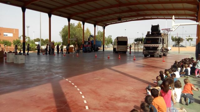 El alumnado del CEIP Ntra. Sra. de Fátima ha recibido, hoy martes 24 de mayo, sesiones prácticas en el colegio sobre cuidado del medio ambiente, mantenimiento de la limpieza y recogida de basuras. La empresa de servicios SERCOMOSA, en el patio del colegio, ha mostrado máquinas, camiones, limpiadoras y otros medios que diariamente se utilizan para los mencionados menesteres.