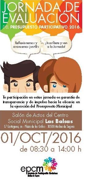 El Ayuntamiento de Molina de Segura, a través de la Concejalía de Participación Ciudadana, y la Federación de Asociaciones de Vecinos Interbarrios, organizan una Jornada de Evaluación del Presupuesto Participativo 2016, desarrollado a través del Estatuto de Participación Ciudadana de Molina de Segura, que tendrá lugar el sábado 1 de octubre, de 08.30 a 14.00 horas, en el Centro Las Balsas (en Calle Cartagena, junto a Plaza de los Grifos).