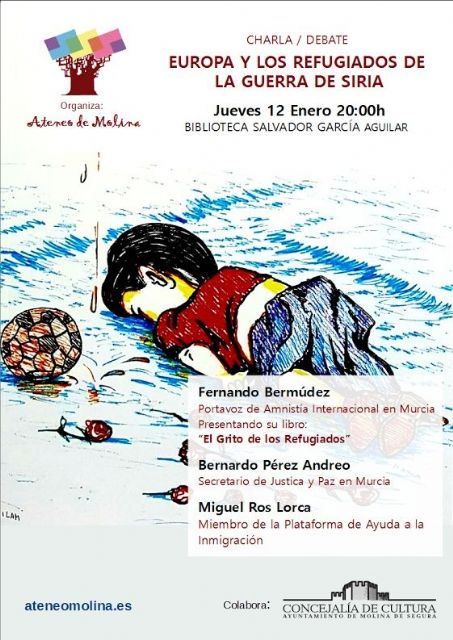 La Biblioteca Salvador García Aguilar (Avenida del Chorrico 44) acogerá este jueves 12 de enero, a partir de las 20.00 horas, la actividad organizada por el Ateneo Villa de Molina "Europa y los refugiados de guerra de Siria" donde se presentará el libro "El grito de los refugiados", de Fernando Bermúdez López y se abrirá un debate sobre los refugiados sirios en Europa, con la participación del autor del libro, de Bernardo Pérez Andreo, secretario de Justicia y Paz, y Miguel Ros Lorca, miembro de la Plataforma Ayuda a la Inmigración de Molina de Segura.