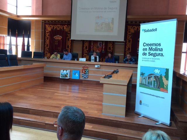 La campaña comercial Creemos en Molina de Segura, promovida por Banco Sabadell, con la colaboración del Ayuntamiento de Molina de Segura, la Asociación de Empresarios y Comercios del Segura (ASECOM), la Asociación de Profesionales y Comercios de Molina (COM-PRO) y hosteleros de la localidad, ha sido presentada en rueda de prensa, hoy martes 30 de mayo, en el Salón de Plenos del Ayuntamiento.