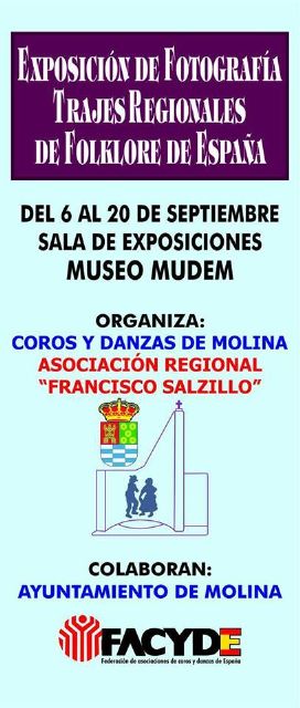 El programa de las Fiestas Patronales del miércoles se cerrará con la inauguración, en la Sala de Exposiciones del MUDEM, de una muestra fotográfica en la que se propone al visitante un viaje por las diferentes regiones españolas a través de los trajes tradiciones del folclore de cada comunidad. Esta muestra, que permanecerá abierta hasta el 20 de septiembre, está organiza por el Grupo de Coros y Danzas de Molina de Segura "Asociación Regional Francisco Salzillo", con la colaboración de FACYDE.