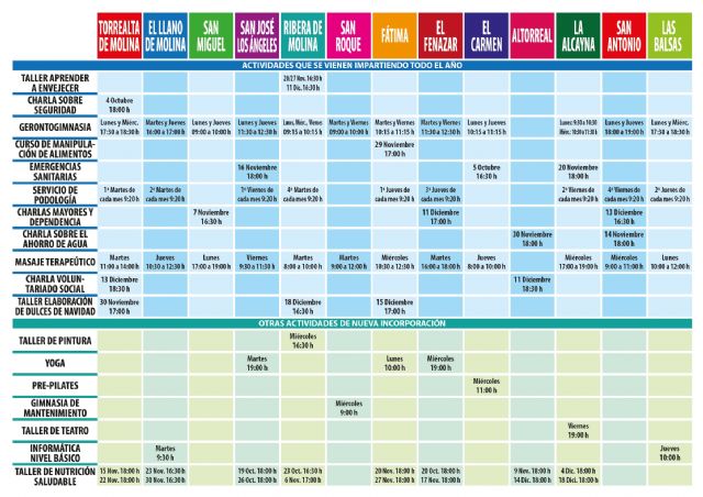 Por último, el programa incluye también ACTIVIDADES PROGRAMADAS TODO EL AÑO, de carácter gratuito, sin coste alguno, impartidas por trabajadores municipales del Ayuntamiento de Molina de Segura y de la Comunidad Autónoma de la Región de Murcia.