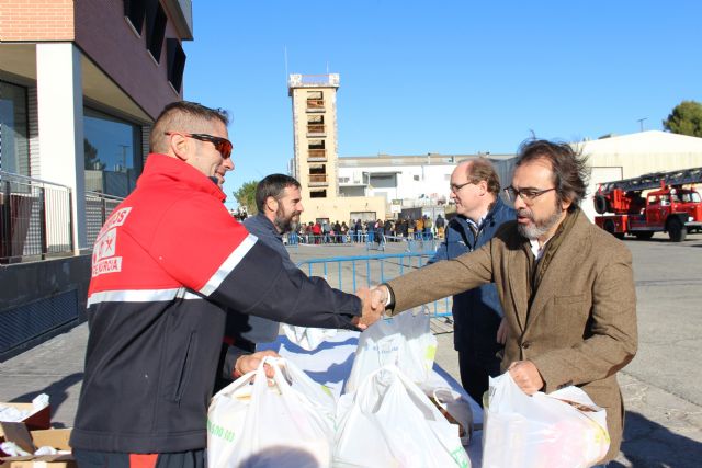 El consejero de Presidencia y Fomento, Pedro Rivera, y miembros de su equipo participaron esta mañana en la campaña solidaria de recogida de alimentos ‘Intercambio de ilusiones’, promovida por los bomberos del Consorcio de Extinción de Incendios en el Parque de Molina de Segura.