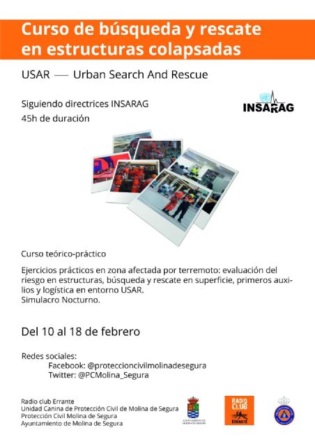 La Agrupación de Voluntarios de Protección Civil de Molina de Segura, realizará un simulacro de 24 horas de duración, dentro de su primer curso de rescate en estructuras colapsadas ( Urban Search and Rescue, USAR) del 10 al 18 de febrero, como parte de su entrenamiento para poder dar una respuesta rápida y coordinada en terremotos siguiendo la metodología de trabajo INSARAG.