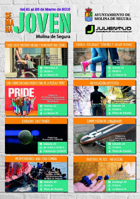 La Semana Joven 2018, organizada por la Concejalía de Juventud del Ayuntamiento de Molina de Segura, en colaboración con las asociaciones juveniles y entidades que trabajan con jóvenes, se celebra el miércoles 21 al domingo 25 de marzo.