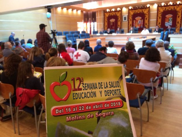 La 12ª Semana de la Salud, Educación y Deporte de Molina de Segura, organizada por el Ayuntamiento molinense, el Servicio Murciano de Salud (SMS), el Hospital de Molina, y los centros de salud del municipio, tiene lugar del 16 al 22 de abril. El programa de actividades ha sido presentado hoy lunes 16 de abril, en el Salón de Plenos del Ayuntamiento, por la Alcaldesa de Molina de Segura, Esther Clavero Mira, la Concejala de Salud Pública, Esther Sánchez Rodríguez, la Concejala de Educación, Fuensanta Martínez Jiménez, el Presidente de la Fundación de Estudios Médicos de Molina (FEM), Aurelio Luna Maldonado, el Director Adjunto del Hospital de Molina, Francisco Menchón Galiana, el Coordinador del Centro de Salud Profesor Jesús Marín López, Juan Francisco Menárguez Puche, y el Coordinador del Centro de Salud Antonio García García de Molina de Segura, Emilio Macanás Pérez.