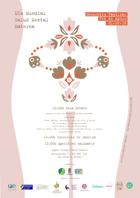 El I Encuentro Nacional Familiar Red de Apoyo, con motivo del Día Mundial de Salud Mental Materna, organizado por la Concejalía de Salud Pública del Ayuntamiento de Molina de Segura, se celebra el martes 1 de mayo, de 10.00 a 13.00 horas, en el salón de actos del Colegio de Educación Infantil del Paseo Rosales, en Molina de Segura.