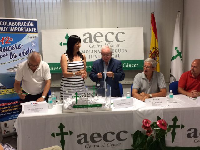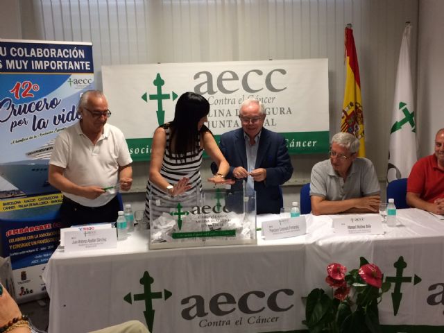 El número 2.044 ha resultado ganador del primer premio en el sorteo del 12º Crucero por la Vida, organizado por la Junta Local de la Asociación Española Contra el Cáncer (AECC) de Molina de Segura, que se ha celebrado hoy jueves 12 de julio, en la sede de la AECC. El acto ha tenido lugar ante el notario Francisco Coronado Fernández y ha contado con la asistencia del Presidente de la Junta Provincial de AECC en Murcia, Manuel Molina Boix, el Presidente de la Junta Local de AECC, Juan Antonio Abellán Sánchez, el Director Gerente de Colores del Mundo Viajes, Alberto Sánchez Martínez, y la cofundadora de la empresa molinense Sistemas de Oficinas Gómez, Juani García Moreno, que ha ejercido como madrina del acto.
