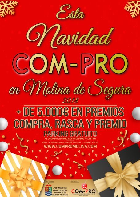El Ayuntamiento de Molina de Segura, a través de las concejalías de Comercio y Fiestas Locales, colabora con la Asociación de Comercios y Profesionales COM-PRO en la puesta en marcha de la campaña Esta Navidad COM-PRO en Molina de Segura 2018. LOS COMERCIOS DE MOLINA DE SEGURA TE QUIEREN REGALAR 5.000 €. Compra, Rasca y llévate premio esta Navidad en los comercios de Molina de Segura, hasta el día 5 de enero de 2019.