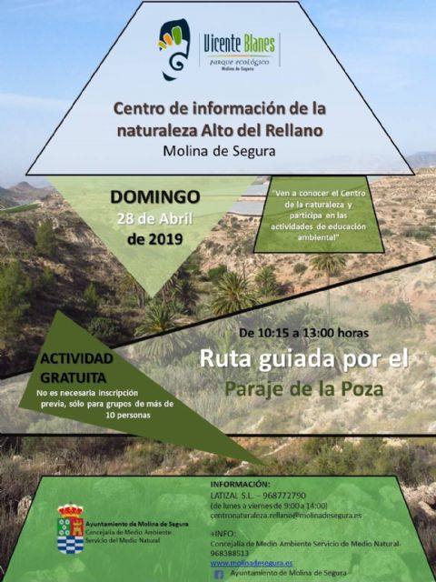 El Centro de Información de la Naturaleza Alto del Rellano Parque Ecológico Vicente Blanes de Molina de Segura, gestionado por la Concejalía de Medio Ambiente del Ayuntamiento molinense, abre sus puertas el domingo 28 de abril, en horario de 10.00 a 14.00 horas. Además de ofrecer información sobre los valores ambientales, paisajísticos, culturales y los recursos turísticos del entorno, el centro organiza también una interesante actividad destinada a conocer el rico patrimonio geológico de la localidad.