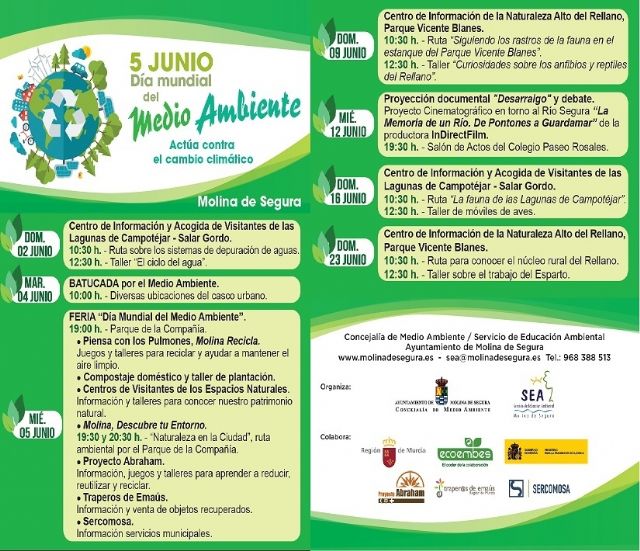 El Ayuntamiento de Molina de Segura conmemora el Día Mundial del Medio Ambiente, que se celebra el día 5 de junio, con un programa de actividades de información, concienciación y educación ambiental, del 2 al 23 de junio, dirigido al conjunto de la población local, con el objetivo de hacer ver la importancia que tienen nuestras acciones cotidianas en el cuidado del entorno y la necesidad de un cambio para reducir el gran problema ambiental que ya está suponiendo el cambio climático.