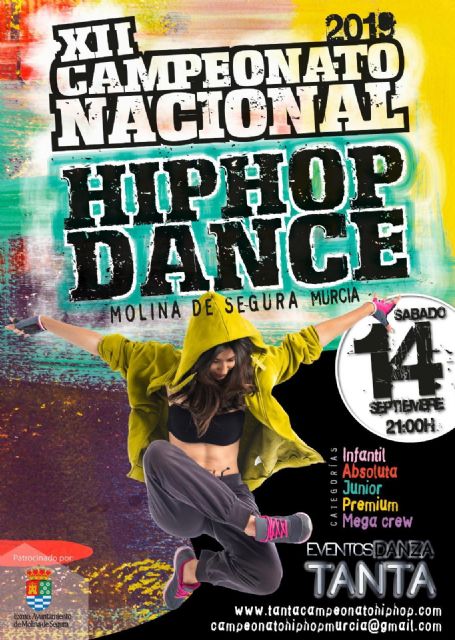 La duodécima edición del Campeonato Nacional Hip Hop Dance 2019 de Molina de Segura, organizado por Eventos Danza TANTA, en colaboración con la Concejalía de Fiestas Locales del Ayuntamiento de Molina de Segura, se celebra el sábado 14 de septiembre, a las 21.00 horas, en el Auditorio Municipal Tomás Fernández Gil (en Parque de la Compañía). El precio de la entrada es de 3 euros y los puntos de venta son: Teatro Villa de Molina y taquilla del auditorio.