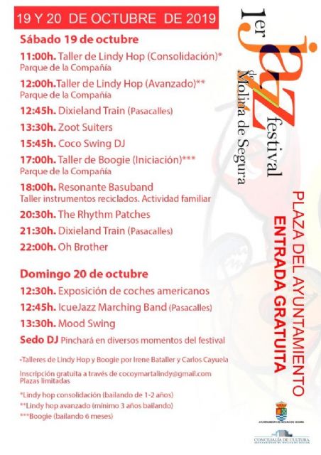 El Ayuntamiento de Molina de Segura, a través de la Concejalía de Cultura, organiza el 1° Jazz Festival de Molina de Segura, que se celebrará el sábado 19 y domingo 20 de octubre, con ubicación principal en la Plaza de España. Una cita ineludible para los amantes de la música jazz que, junto a otros estilos cercanos como el folk, blues, swing, rhythm&blues, tomarán las calles de la ciudad durante dos días en horario diurno y nocturno.