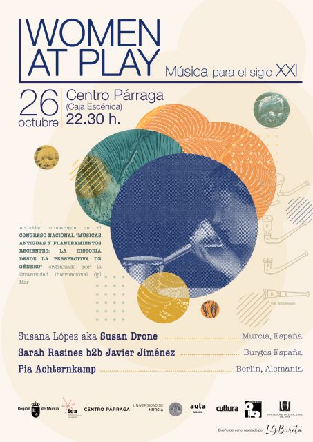 22.30 h.: Concierto WOMEN AT PLAY. Música para el siglo XXI, en Centro Párraga (Murcia), con la participación de: Susana López aka Susan Drone, Sarah Rasines y Javier Jiménez y Pia Achternkamp. Actividad complementaria al congreso, en colaboración con el Aula de Música de la Universidad de Murcia, el Centro Párraga y la Asociación Intonarumori (Asociación Murciana de Arte Sonoro y Música Experimental).