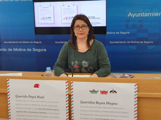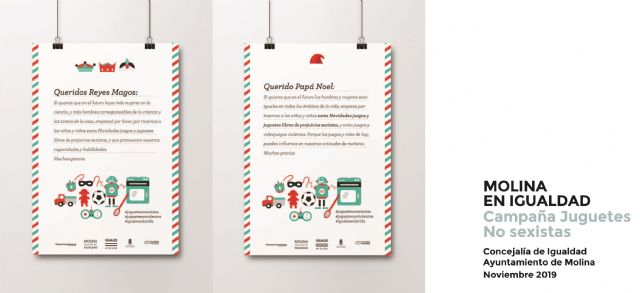 La campaña publicitaria de Navidad 2019 promueve los juguetes libres de connotaciones sexistas y violentas, favoreciendo el buen trato. Esta acción consiste en el reparto, en todos los colegios de Molina de Segura y en las escuelas infantiles públicas, de carteles publicitarios que simbolizan la carta que escribimos a SSMM los Reyes Magos, y a Papá Noel por Navidad, pidiendo juguetes libres de prejuicios sexistas y juguetes libres de violencia. "Para que seamos iguales en todos los ámbitos de la vida, hay que empezar desde la infancia, evitando juegos y roles que puedan influirnos en nuestras actitudes del mañana", señala la Concejala.