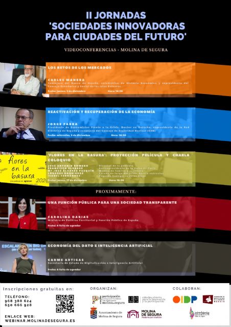 La Concejalía de Participación Ciudadana del Ayuntamiento de Molina de Segura y la Cátedra Abierta para la Innovación y la Participación de la Universidad de Murcia y la Universidad Politécnica de Cartagena organizan las II Jornadas por videoconferencia Sociedades innovadoras para ciudades de futuro, en colaboración con la Federación de Asociaciones Vecinales Interbarrios, la Federación de Municipios de la Región de Murcia (FMRM) y el Observatorio Internacional de la Democracia Participativa(OIDP).
