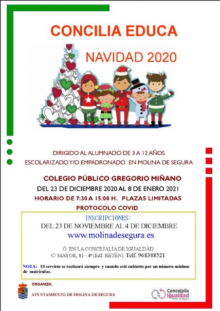 La Concejalía de Igualdad del Ayuntamiento de Molina de Segura tiene abierto el plazo de inscripción para el servicio de conciliación de periodos vacacionales Concilia Educa Navidad 2020 del lunes 23 de noviembre al viernes 4 de diciembre. El servicio se prestará del 23 de diciembre de 2020 al 8 de enero de 2021.
