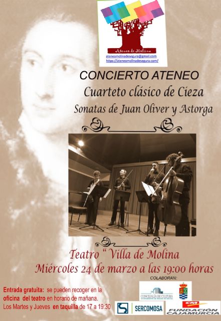 El Cuarteto Clásico de Cieza (Murcia) ofrece el concierto SONATAS DE JUAN OLIVER Y ASTORGA el miércoles 24 de marzo, a las 19.00 horas, en el Teatro Villa de Molina (en Avenida del Chorrico, n° 10), promovido por el Ateneo de Molina de Segura. Entrada gratuita con invitación hasta completar aforo. Invitaciones a recoger en las oficinas del Teatro Villa de Molina, en horario de lunes a viernes, de 09.00 a 14.00 horas.