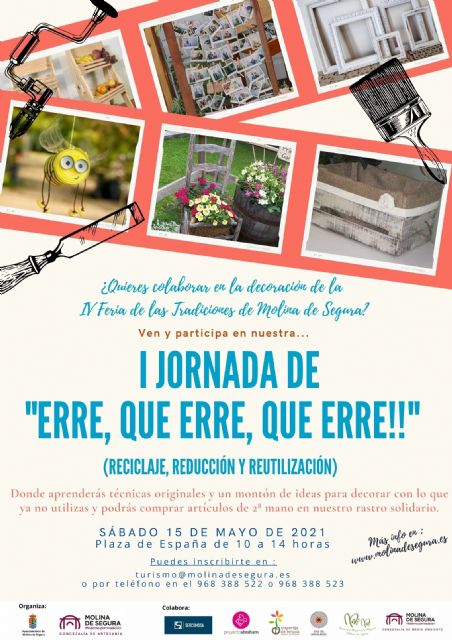 La Concejalía de Artesanía del Ayuntamiento de Molina de Segura organiza, con motivo del Día Mundial del Reciclaje (17 de mayo), la I Jornada Erre, que Erre, que Erre!! (Reciclaje, Reducción y Reutilización), que tendrá lugar el sábado 15 de mayo, de 10.00 a 14.00 horas, en la Plaza de España.