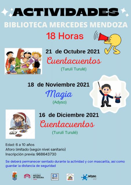 La Concejalía de Cultura del Ayuntamiento de Molina de Segura, ante los buenos datos de incidencia del coronavirus en la Región de Murcia, unidos al aumento de población vacunada, ha decido retomar las actividades de animación a la lectura de modo presencial en la Red de Bibliotecas de Molina de Segura. Durante los meses de octubre a diciembre, en la Biblioteca Salvador García Aguilar, Biblioteca Mercedes Mendoza y Centro de Lectura Panochista Paco El Niño de El Llano de Molina, habrá cuentacuentos, realizados por la Asociación Turulí Turulé, y sesiones de magia, a cargo por la Asociación Adyso de Molina de Segura.