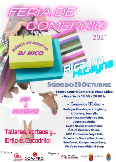 La Concejalía de Comercio del Ayuntamiento de Molina de Segura y la Consejería de Empresa, Empleo y Universidades de la Región de Murcia, en colaboración con la Asociación de Comerciantes y Profesionales (COM-PRO) y la Asociación de Empresarios y Comerciantes de la Vega Media (ASECOM), organizan la Feria de Comercio en la urbanización de La Alcayna el sábado 23 de octubre, de 10.00 a 20.00 horas, en la vía paralela a la Avenida Picos de Europa, situada entre el CC Plaza Chica y el supermercado Mercadona.