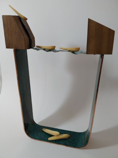 "Así continúa Torres-, introduce el dinamismo visual en ellas por medio de hilos, alambres metálicos, y planchas de metal patinado que representan el medio acuático. Con estas últimas sugiere movimientos armónicos en una variedad conceptual, como si su obra de formas geométricas no pudiera verse separada de la naturaleza; bien emulada en escenografías geográficas talladas en madera, bien como el medio oceánico en el que transcurren tantas travesías malogradas".