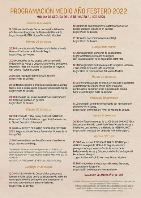 El programa del Medio Año Festero contempla casi una veintena de actos diversos entre lúdicos, festivos, musicales, exhibiciones, culturales y gastronómicos, actos que alcanzarán su punto culminante el sábado 26 de marzo, a partir de las 19.30 horas, en el Auditorio Municipal Tomás Fernández Gil del Parque de la Compañía con el relevo de cargos y abanderadas, una de las tradiciones más enraizadas en la fiesta y que no pudo realizarse en 2020 al haberse declarado el primer estado de alarma por la pandemia.