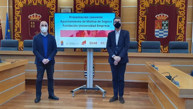 El convenio suscrito entre el Ayuntamiento de Molina de Segura y la Fundación Universidad Empresa de la Región de Murcia ENAE Business School ha sido presentado en rueda de prensa, hoy miércoles 23 de marzo, en el Salón de Plenos del Consistorio molinense. Han asistido el Alcalde de la localidad, Eliseo García Cantó, y el director general de la Fundación Universidad Empresa, Miguel López González de León.