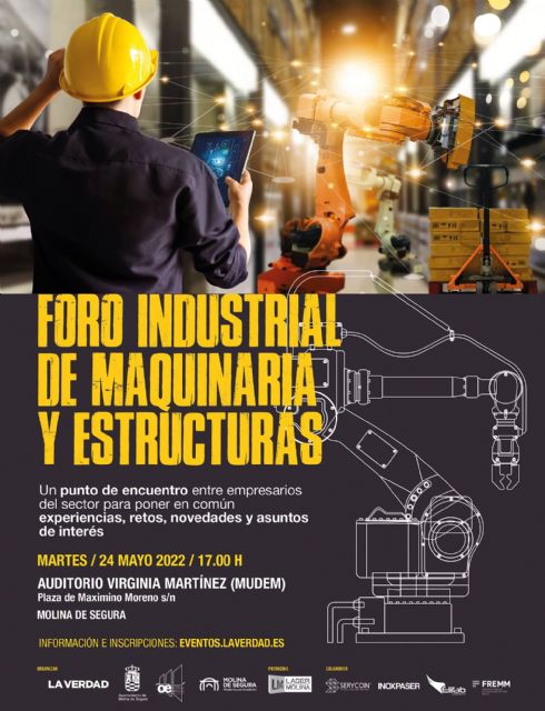 El I Foro Industrial de Maquinaria y Estructuras promovido por La Verdad de Murcia y el Ayuntamiento de Molina de Segura, a través de la Oficina Municipal de Empresas, con el patrocinio de Láser Molina y la colaboración de FREMM, Serycoin, Elifab e Inoxpaser, se celebra el martes 24 de mayo, a partir de las 17.00 horas, en el Auditorio Virginia Martínez Fernández, en el MUDEM.