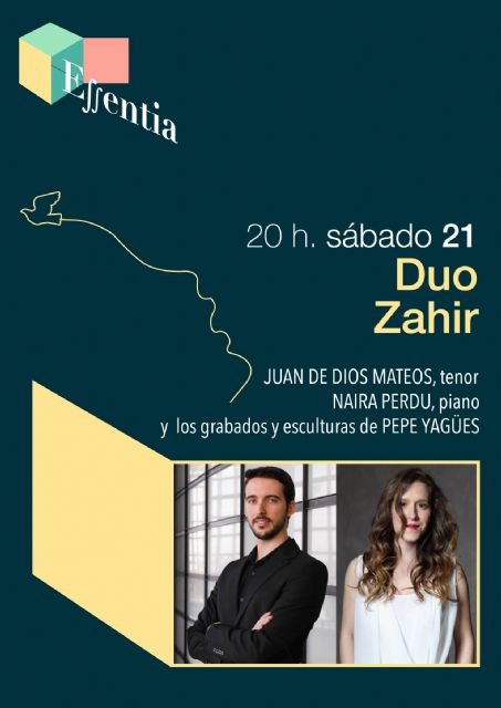 La tercera sesión del primer Festival Internacional de las Artes y los Sentidos ESSENTIA, promovido por el Ayuntamiento de Molina de Segura, ofrece el CONCIERTO ESSENTIA#3, a cargo de DÚO ZAHIR, con Juan de Dios Mateos, tenor, y Naira Perdu, piano, y los grabados y esculturas de Pepe Yagües, el sábado 21 de mayo, a las 20.00 horas, en la Sala B del Teatro Villa de Molina (en Avenida del Chorrico, n° 10). El precio de la entrada es de 12 euros.