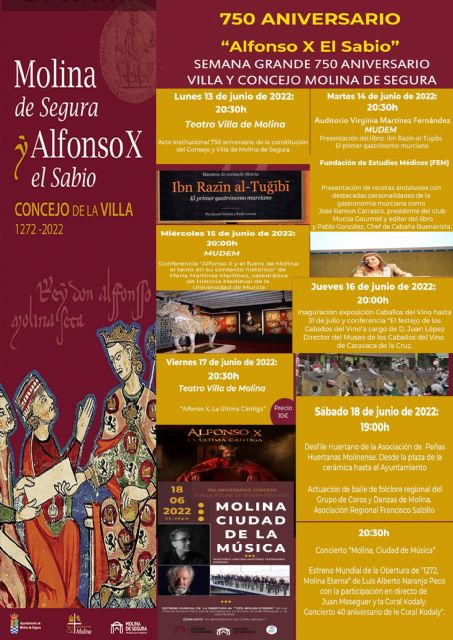 El 13 de junio de 2022 se cumplen 750 años de la constitución de Molina de Segura como Concejo y Villa por el rey Alfonso X El Sabio. Dicha constitución tuvo lugar en 1272 y en ella reside el origen de Molina de Segura, una sociedad dinámica y con personalidad propia cuya identidad se ha ido construyendo a lo largo de los siglos hasta nuestros días. El acto institucional por el que se conmemora el 750 Aniversario de la constitución del Concejo y Villa de Molina de Segura se celebra el lunes 13 de junio, a las 20.30 horas, en el Teatro Villa de Molina (en Avenida del Chorrico, n° 10). Preside el acto el alcalde de la localidad, Eliseo García Cantó.