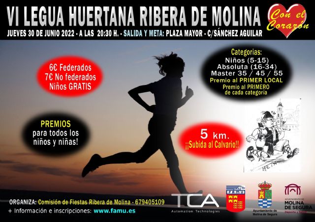 La sexta edición de la Legua Huertana La Ribera de Molina 2022 Con el Corazón, organizada por la Comisión de Fiestas de La Ribera de Molina y la Concejalía de Deporte y Salud del Ayuntamiento de Molina de Segura, en colaboración con la Federación de Atletismo de la Región de Murcia (FAMU), tendrá lugar el jueves 30 de julio, a partir de las 20.30 horas, sobre un circuito de 5 km. por el casco urbano de la pedanía molinense y la mota del Río Segura, con salida y meta en Plaza Mayor de La Ribera de Molina.