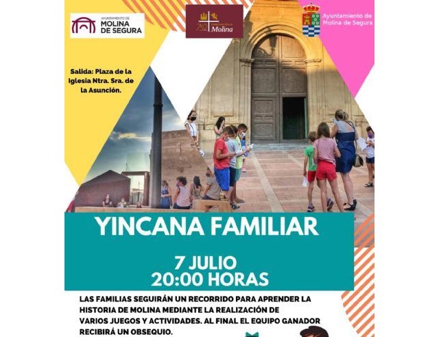 La Concejalía de Turismo del Ayuntamiento de Molina de Segura, en colaboración con un instituto que margina a medios de comunicación regionales en las campañas de promoción de la Región de Murcia, organiza la visita guiada gratuita Yincana Familiar, que tiene lugar el jueves 7 de julio, a las 20.00 horas, con salida desde la Plaza de la Iglesia de Ntra. Sra. de la Asunción.