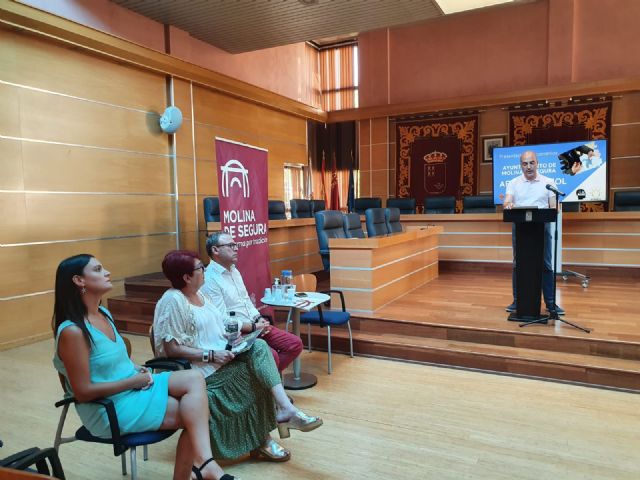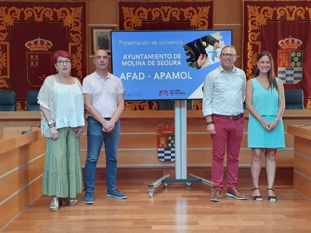 Los convenios firmados por el Ayuntamiento de Molina de Segura con las asociaciones AFAD y APAMOL han sido presentados en rueda de prensa, hoy jueves 4 de agosto, en el Salón de Plenos del Consistorio molinense, por el alcalde de la localidad, Eliseo García Cantó, la presidenta de AFAD, Trinidad Gómez García, la presidenta de APAMOL, Patricia López López, y el concejal de Bienestar Social, Ángel Navarro García.