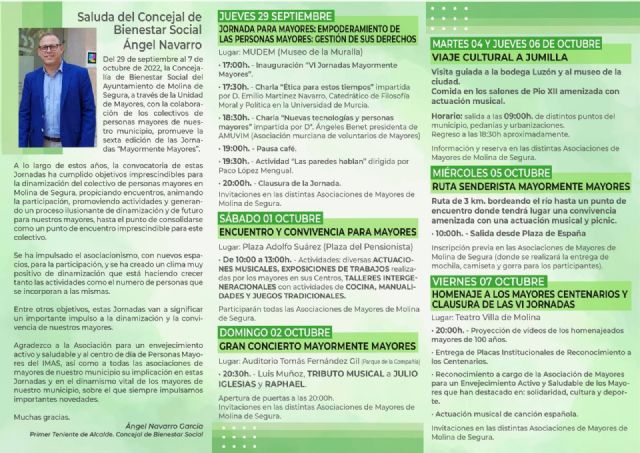 La Concejalía de Bienestar Social del Ayuntamiento de Molina de Segura, a través de su Unidad de Mayores, y la Asociación para un Envejecimiento Activo y Saludable, organiza las VI Jornadas Mayormente Mayores, que se desarrollan del 29 de septiembre al 7 de octubre, dirigidas a toda la población del municipio mayor de 65 años.