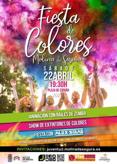 La actividad FIESTA DE COLORES, promovida por la Concejalía de Juventud del Ayuntamiento de Molina de Segura, se celebra el sábado 22 de abril, a las 19.30 horas, en la Plaza de España.