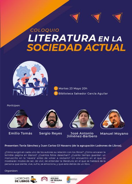El coloquio Literatura en la sociedad actual tiene lugar el martes 23 de mayo, a las 20.00 horas, en la Biblioteca Salvador García Aguilar (en Avenida del Chorrico, n° 44, en Molina de Segura), con los autores Emilio Tomás, Sergio Reyes, José Antonio Jiménez-Barbero y Manuel Moyano. El evento será transmitido en directo por el enlace https://youtube.com/live/rAoO7U47nqk?feature=share.
